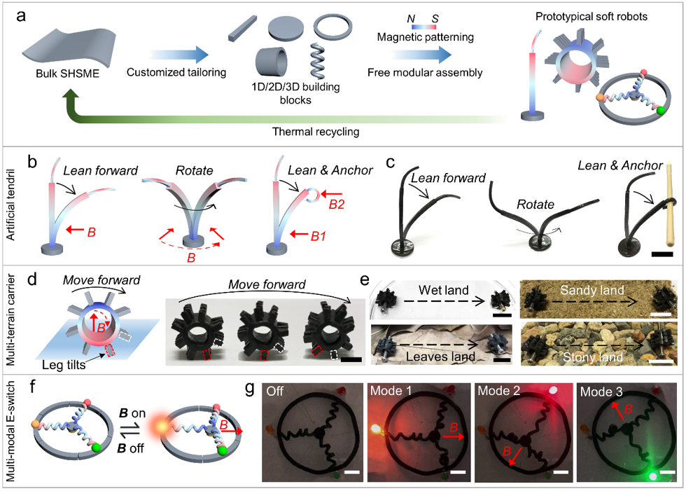 利于SHSME的快速自愈合以及材料热可逆性,研究人员提出了一种模块化组装多功能软体机器人的材料可循环式设计平台,并展示了包括人造藤蔓、多地形运载器以及多模态电子开关等一系列的三维结构功能性软机器人。
