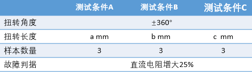 在SCARA机器人中,波纹管中的电缆随关节运动,承受扭转应力。部分电缆在型式试验中会参考电缆测试标准进行试验,例如在TUV标准中,扭转角度±180度,扭转长度为300mm,扭转次数500万次。而在机器人实际使用中,扭转角度由关节最大运动范围和电缆安装长度决定,可能使用条件比厂商扭转条件严苛,因此需根据实际工况制定扭转角度/长度/次数进行试验。