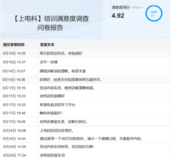 学员们通过培训,认识互联网+与数字化转型的新知识和新概念,结合多个实例分析学习;掌握人工智能的基本概念和常见算法,以及通过实际应用案例快速入门;了解人工智能很常用的编程语言以及主要人工智能算法,结合典型案例进行分析;熟悉3D打印技术基础原理及未来发展前景等相关内容,获得了学员们的好评,也得到了一些意见与建议。